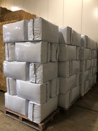 Hiervoor gebruiken we de grote balen (ca. 500 kg) die door de persverpakkingsmachine verwerkt worden tot 25 kg verpakkingen. De grote balen gaan eerst door een machine die de balen lostrekt zodat het product nog extra gecontroleerd wordt op de vereiste kwaliteit. Vervolgens wordt het voordrooggras in een weegbunker afgewogen tot pakjes van 25 kg, waarna ze direct luchtdicht in plastic verpakt worden. Het grote voordeel van dit proces is dat alles wat verwerkt wordt tot kleinverpakking gegarandeerd schimmel- en stofvrij is.